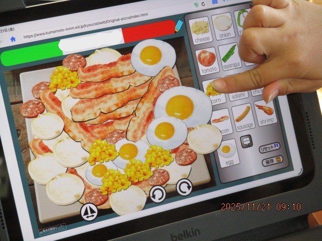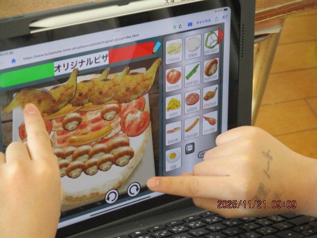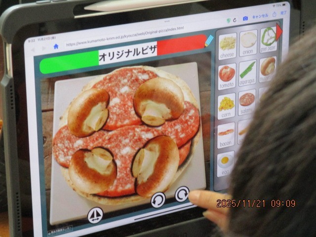 デジタル教材を使って、思い思いのピザを作っています。""bacon,salami,mushroom,…”それぞれが作ったピザを友達に英語で伝えます。