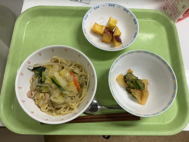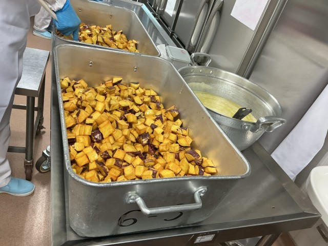 素揚げしたさつまいもにキャラメルソースをあえています。さつまいもと甘いキャラメルソースがよく合います。タンメンの長ねぎと野菜の中華漬けの大根は世田谷区産です。