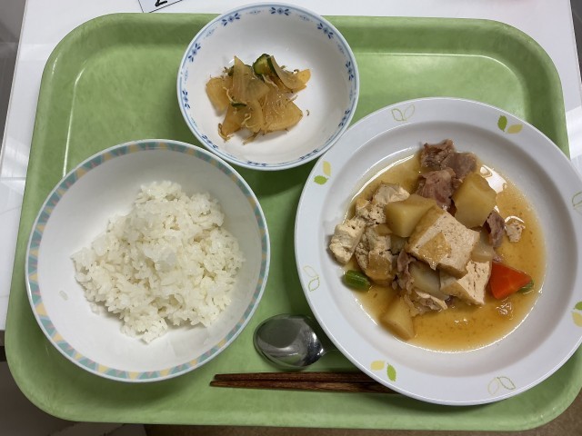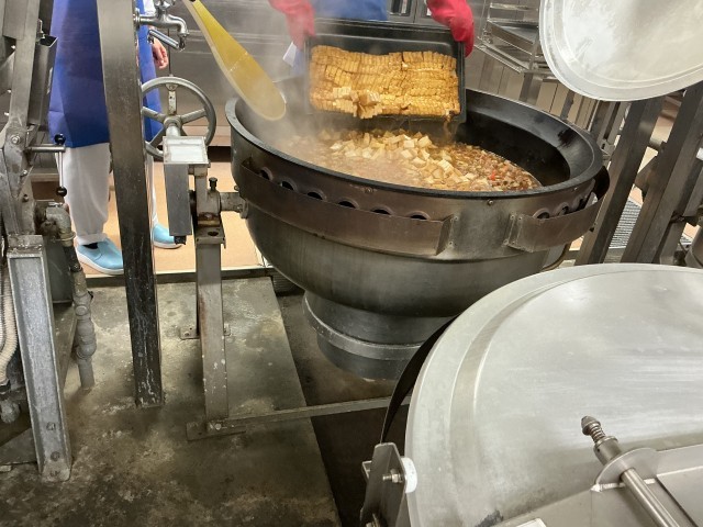 先月有機米が使用できなかったので、今月2回有機米を使っています。ごはんに合う煮物を大きな釜でつくっています。生揚げはオーブンで煮てから最後に加えています。