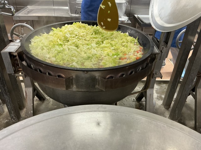 具だくさんなポトフをつくっています。キャベツをたっぷりと加えて煮ています。角切りの豚肉や大きめに切った野菜の食感がおいしい1品です。