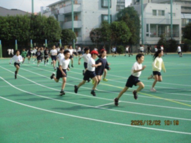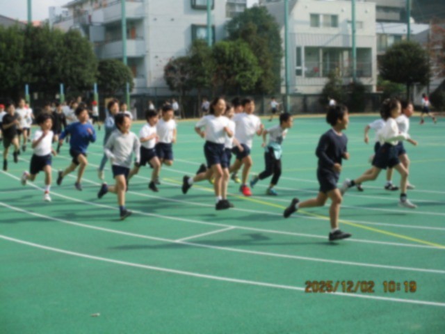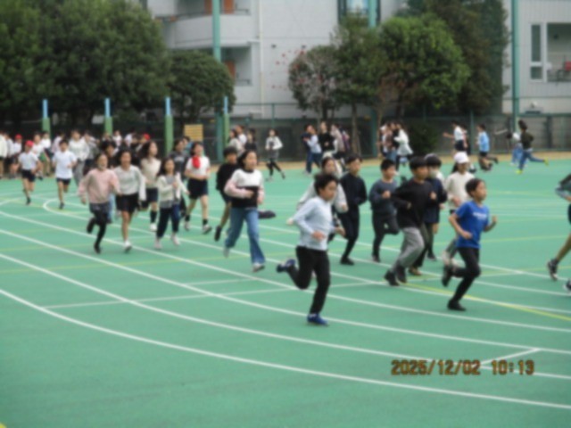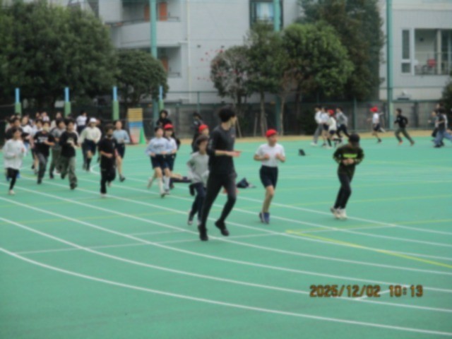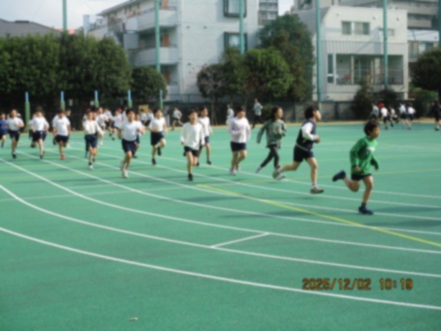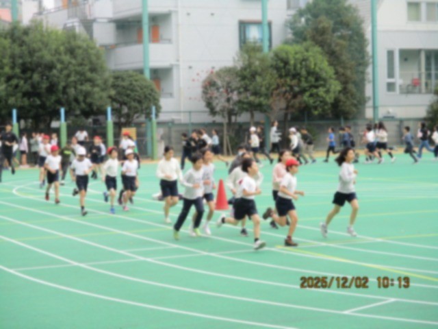 体力と運動意欲の向上を目指して持久走を行います。全学年、3分間走り続けます。一定のペースで走ることや無理はしないことなど、安全に取り組むことができるように声をかけています。