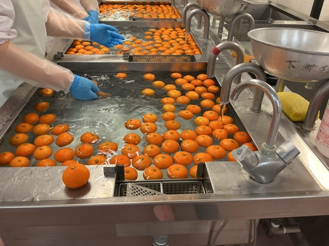 11月3日と12月3日は3日(みっか)の語呂合わせから、みかんの日です。愛媛県産のみかんを1個ずつ洗っています。