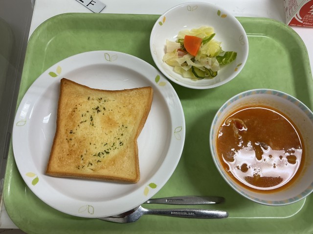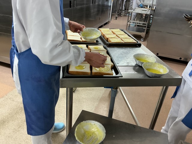 バターとみじん切りにんにくを混ぜてパンに塗っています。この後オーブンで表面を焼いていきます。ミネストローネを浸して食べてもおいしいパン料理です。