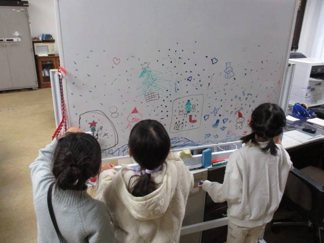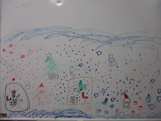 休み時間に校長室に遊びに来てくれた1年生3人が、協力してすてきな絵を描いてくれました。この時期にぴったりの絵で、心が温まりました。