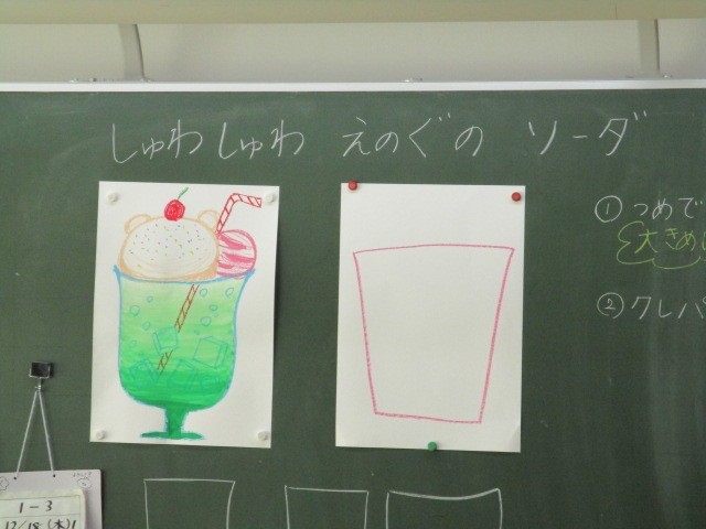 「しゅわしゅわ えのぐのソーダ」をかいています。大きなパフェグラスをかき、その中に自分の好きな中身をかいています。果物、氷、アイスなど、おいしそうなパフェができ上がりました。