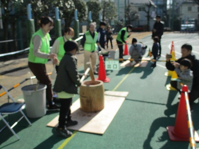 餅つきに始まり、様々な昔遊びを楽しませていただきました。天候にも恵まれ、子どもたちの笑顔が校庭にあふれていました。青少年上馬地区委員会の皆様、本校のPTAの皆様、駒沢中学校の生徒の皆様、ありがとうございました。
