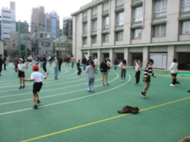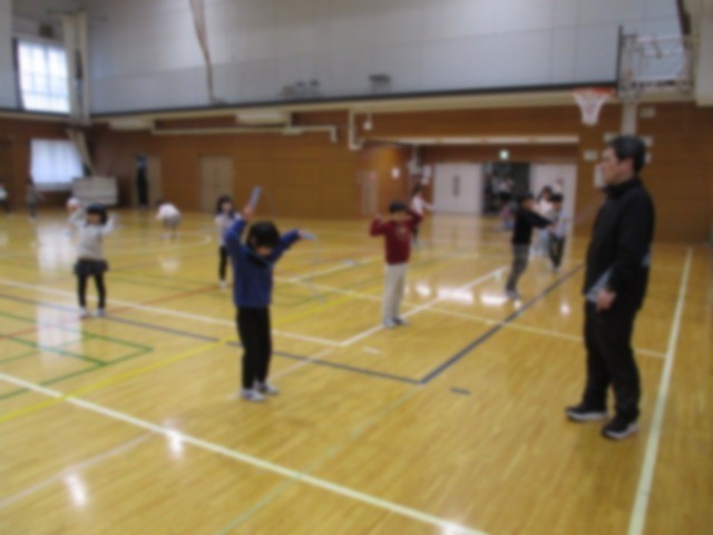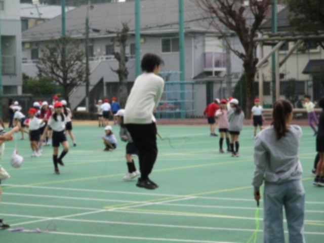 寒さに負けず、元気良く短縄に取り組んでいます。音楽を流しながら行っているので、できる技を曲に合わせて、楽しく運動しています。