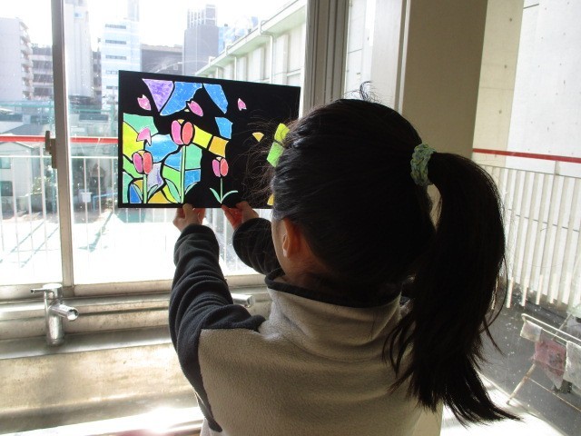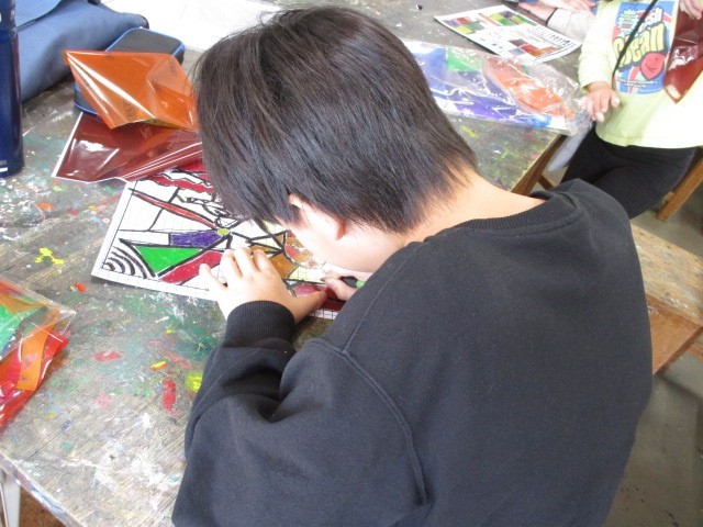 ステンドグラスを作っています。12色のセロハンを使って、自分の思いを表現しています。実際に太陽にかざしてみると、すてきな作品に仕上がっていました。