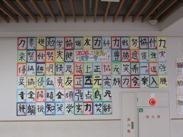 オープンスペースに、一人一人の強い思いが込められた字が飾ってあります。高学年に向けた思いを書いている子もいました。
