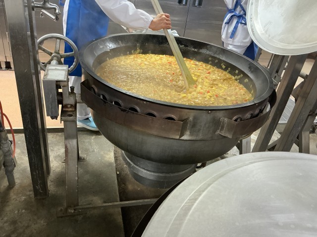 具だくさんのカレーを煮込んでいます。カレー粉だけでなくガラムマサラを少量加えているので、スパイスの香りが増しています。