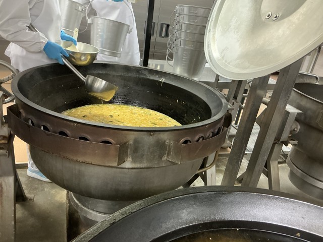かきたま汁の調理が完了し、各クラスごとに盛り付けています。均等に給食が届くようにしっかりと計量しながら食缶に入れています。