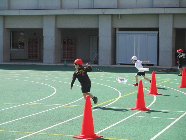 生活科で作ったオリジナル凧を飛ばしました。どの子の凧も気持ち良さそうに空に飛んでいます。壊れた凧を修復する列にはたくさんの子が並んでいました。