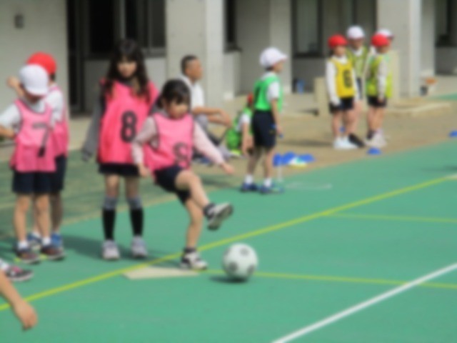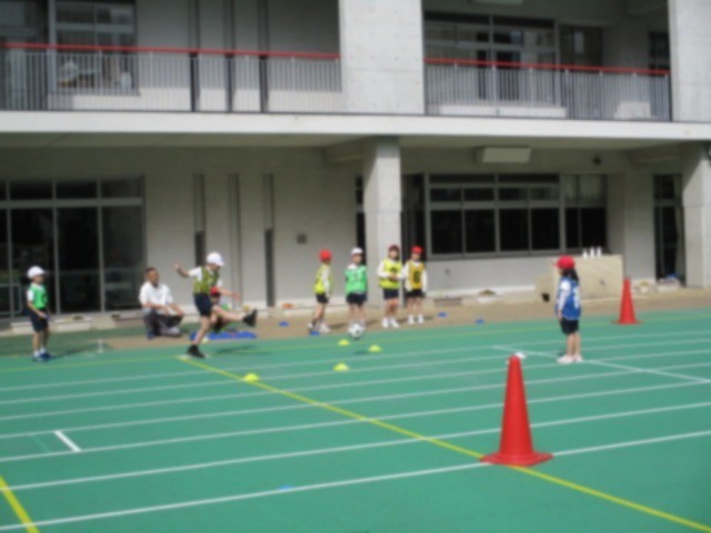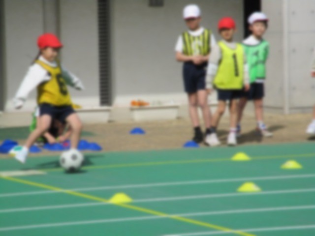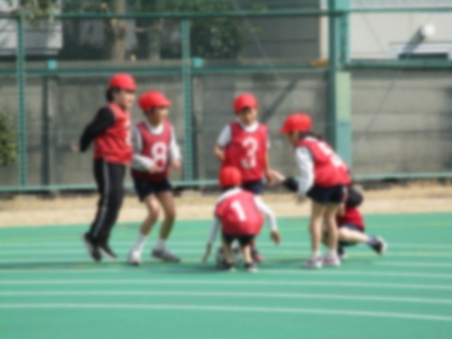 ベースボール型ゲームに取り組んでいます。攻撃側はボールを足でけって走り、守備側はそのボールをキャッチしてチーム全員で丸くなって座ります。どちらが速いかで得点が決まります。