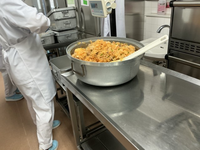トマトジュースを加えて炊いたごはんとケチャップ味の具を混ぜて、チキンライスのできあがりです。計量してそれぞれのごはん食缶に入れていきます。
