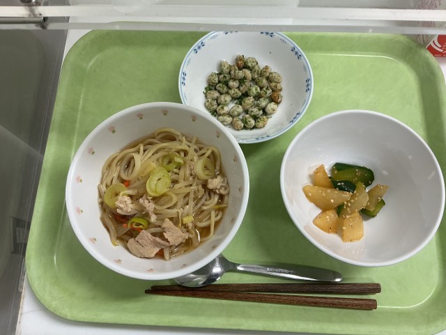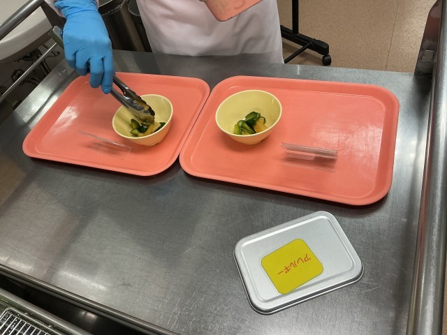 きゅうりの中華味には炒りごまが入っているので、ごま除去食を別の場所で盛り付けています。安全に給食が提供できるように、除去食対応の食器・トレーの色が通常と異なります。