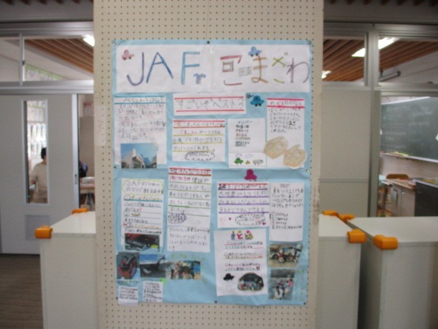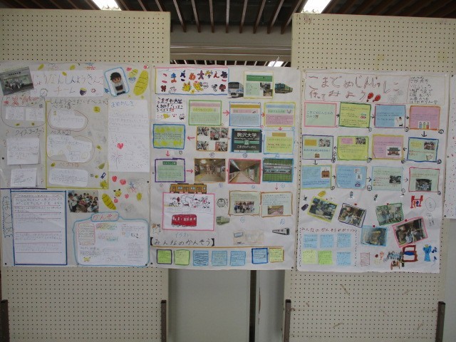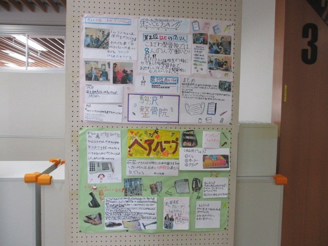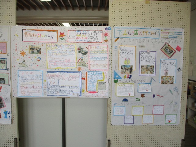 町探検のまとめです。グループごとに分かったことをまとめました。色づかいやレイアウトを工夫し、見やすくまとめることができました。
