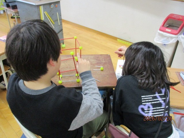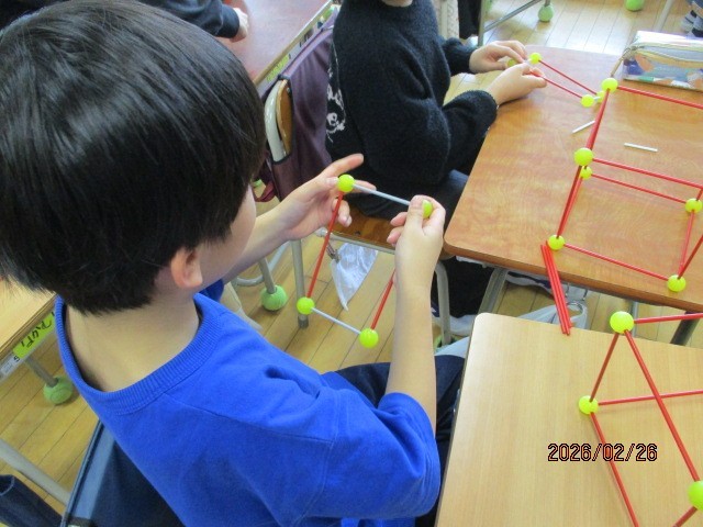 頂点と辺を学んでいます。渡された棒(辺)と黄色い玉(頂点)をどのように組み合わせると箱になるのでしょうか。試行錯誤しながら学んでいます。