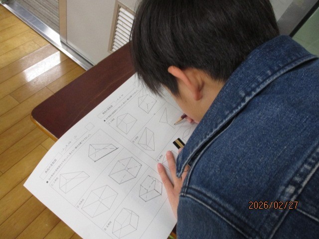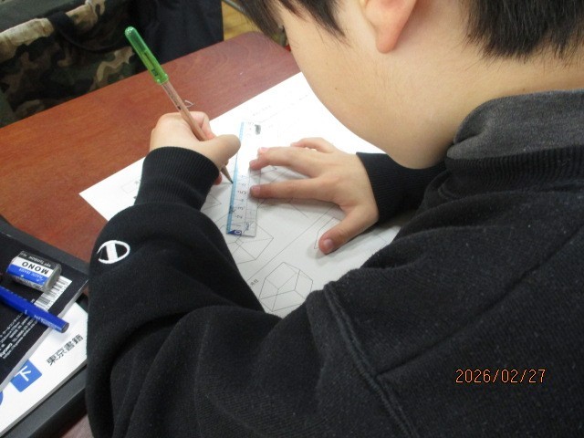 見取り図をかいています。実線でかく線と点線でかく線があります。どの辺が見えるのか考えながら、繰り返しかいています。