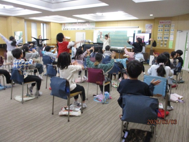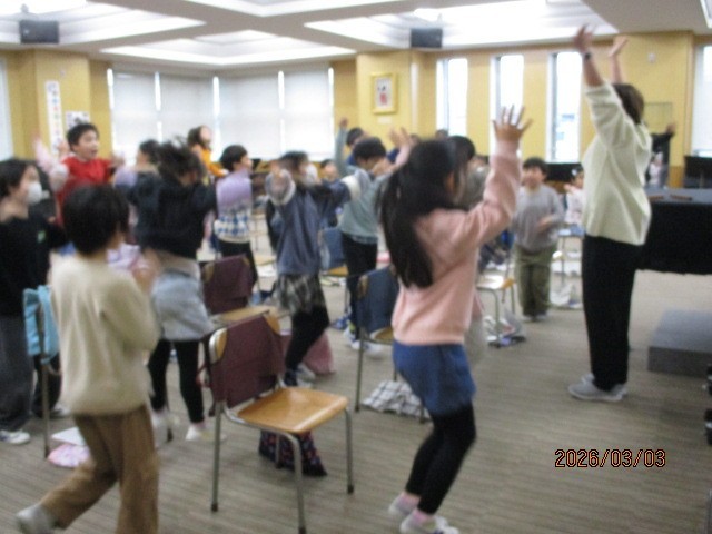 リズムに合わせて体を動かしています。「いいね」という教員の声に反応し、どの子もさらに頑張る姿が見られました。楽しんで音楽に親しんでいます。
