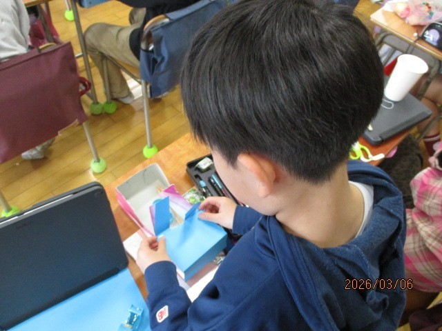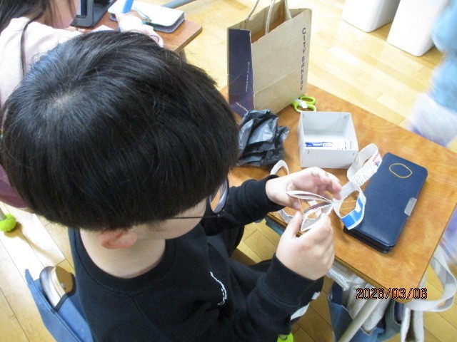 理科で学習した知識を活用して遊び道具を作っています。磁石の力、ゴムの力を活かして、夢中で製作活動に取り組んでいます。