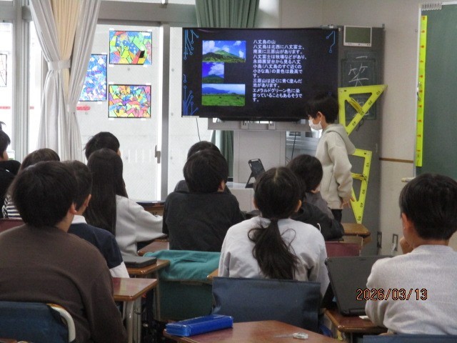 小笠原諸島や八丈島の魅力を伝えています。今回はパワーポイントを使ってまとめました。聞き手の興味を引くように、見せ方を工夫しています。