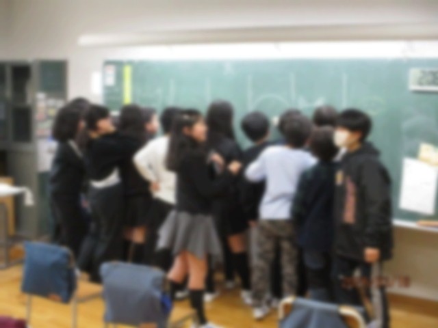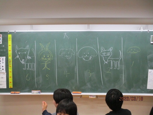 一筆がきでお題(犬)を描くゲームに取り組んでいました。黒板には6グループの力作が並んでいます。勝敗は多数決で決まります。皆様でしたらどの犬を選びますでしょうか。