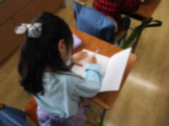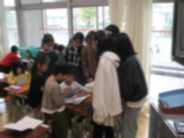 初めての休み時間。本を読んだり、お絵かきしたりしています。他学年の子がたくさん遊びに来てくれ、じゃれ合っている姿がほほえましいです。