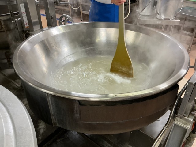 1年生の給食が始まりました。新しい環境の中、1年生もしっかりと給食を食べていました。ゼリーは給食室で大きな釜で寒天を煮溶かしゼリー液をつくっています。