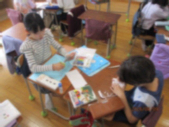 同じ当番の子が集まって、メンバーや活動内容が分かるポスターをつくっています。作業を分担したり、話し合ったり、協力して進められています。