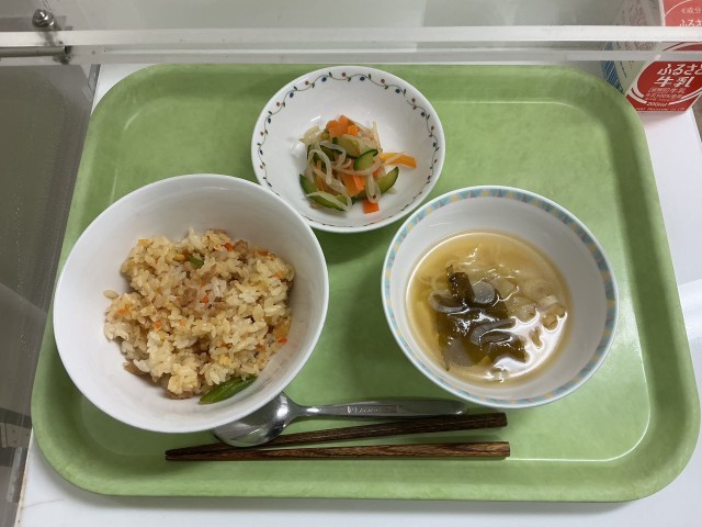 鶏ひき肉以外ににんじんなどの野菜・しいたけ・大豆をみじん切りにしてごはんに混ぜています。甘辛いそぼろごはんを子どもたちはしっかりと食べていました。