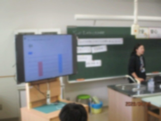 自身の生活時間を見直しています。一人一人がタブレットに配布されたアンケートに答え、その答えがすぐに集約されて黒板横の画面に映ります。どうやら、起床・就寝時刻が定まっていない子が多いようです。