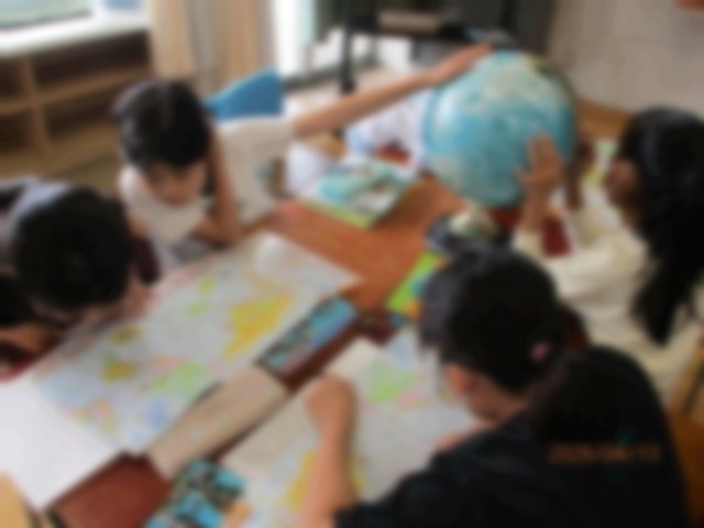 世界の国々の場所を地球儀で探しています。地図帳で認識する場所と地球儀での場所は大きく異なります。くるくる回しながら探していました。