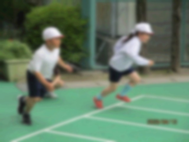 50m走をしています。「用意~」と言われたら、ピタッと体の動きを止めることがなかなか難しいようです。待っている間は大縄を跳んで待ちます。