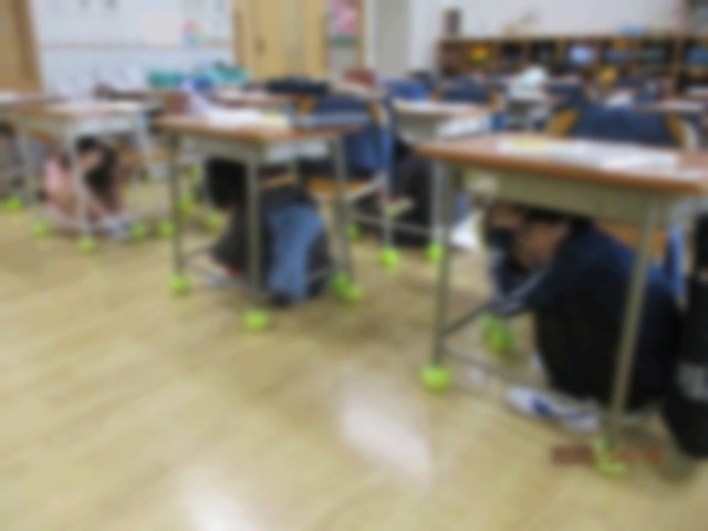 1年生にとっては初めての訓練でしたが、机の下に上手にもぐり、防災頭巾をしっかりと被ることができていました。避難の際の大切なことは「自分の身は自分で守る」です。繰り返し指導していきます。