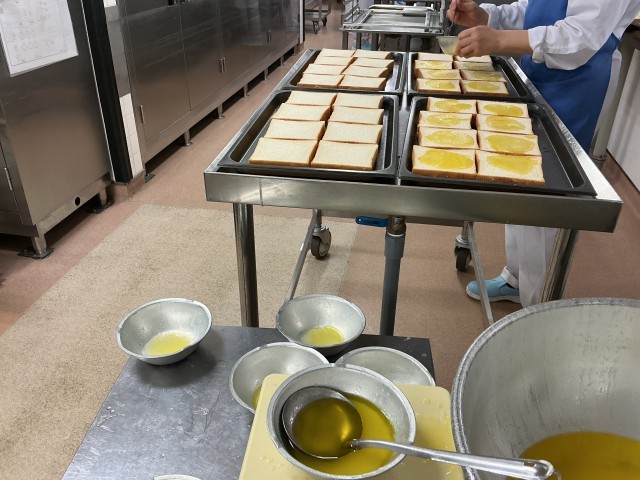 バターとグラニュー糖を混ぜ、全員に均等になるよう計量しながら食パンに塗っています。食パンは低学年・中学年・高学年と量が変わります。