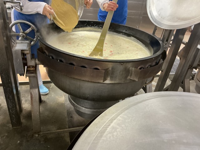 粒状のコーンとつぶしてクリーム状にしたコーンの両方が入っているシチューをつくっています。ホワイトルウを加え、 こげないように煮込んでいます。