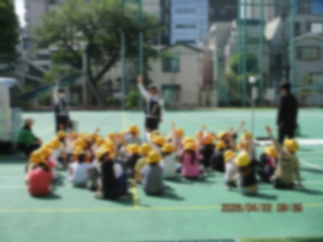世田谷警察署の方に、横断歩道の渡り方を教えていただきました。昔から変わらずですが、「右見て、左見て、もう一度右見て」歩く練習をしました。