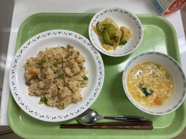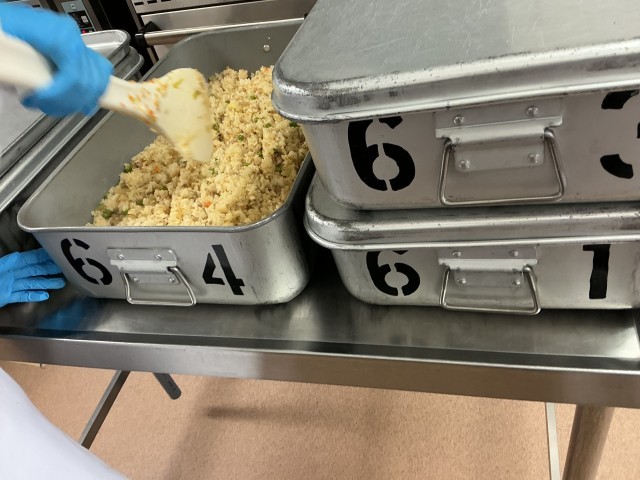 チャーハンの具が均等になるように、各学級のチャーハンを混ぜています。控えめに加えたにんにくの香りが食欲を増す一品です。