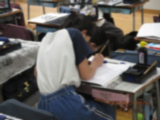 今日は「湖」でした。数枚書いた中でどちらが納得のいく作品か選んでいます。普段とは違い、気持ちを整えて黙々と書いています。