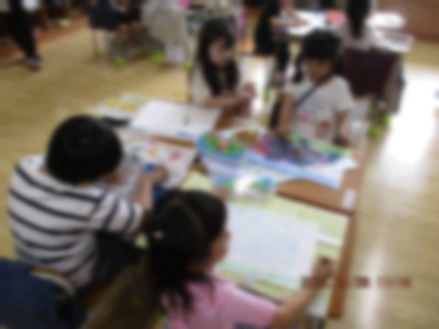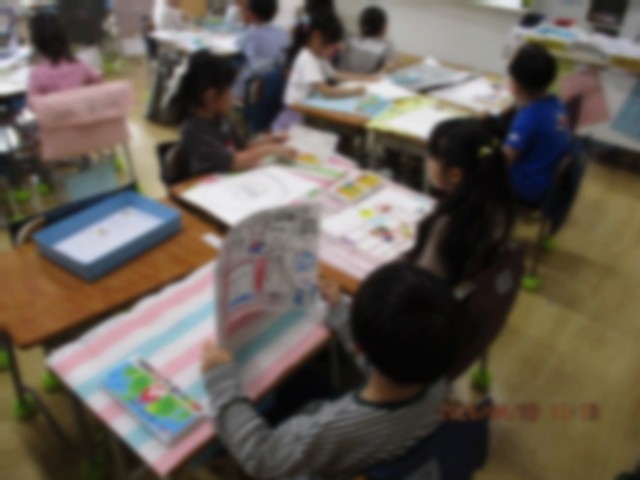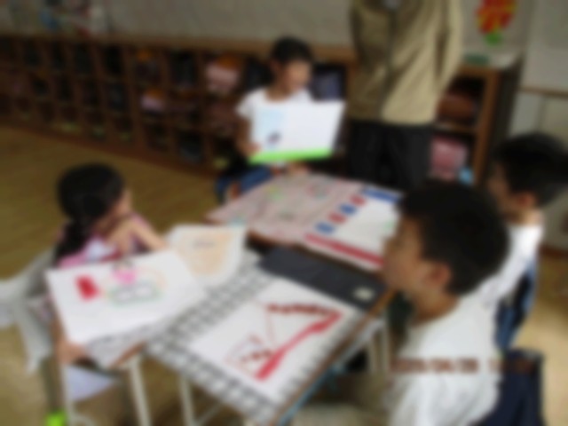 自分の好きなものを画用紙いっぱい表現しています。みんなが書き終わったら、友達同士で描いたものを紹介し合っています。