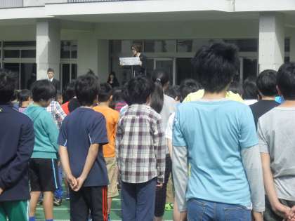 それから、環境委員会の人が毎年プランターに花を植えたり水やりをしたり、ポスターなどをつくってみなさんが電気や水を大切にしてくれるように活動しています。みなさんは、環境にやさしい工夫としてどんなことができるでしょうか。たとえば、水を出しっぱなしにしない、教室を出るときは電気を消す、夏は冷房の温度を低くしない(冬は暖房の温度を高くしない)など身近なところからできることを一人一人が実行してみてください。