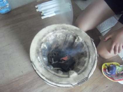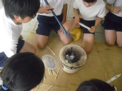 昔の道具を学習する時間に、七輪を使った火おこしを体験しました。なかなか火がつかず苦戦しましたが、無事に火がつくとおもちを焼いておいしく食べました。