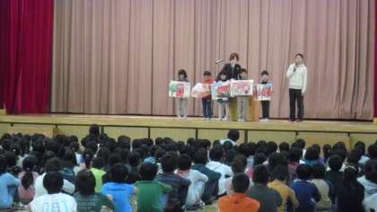 今日はこの後、5月の消防写生会ですてきな絵を描いて、入選したお友達を紹介しますので、名前を呼ばれたらステージに上がってください。