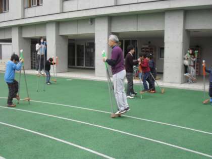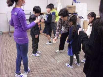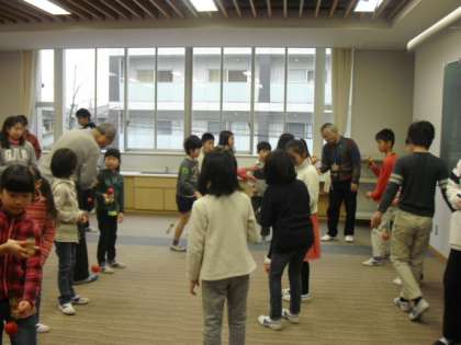 1月15日、地域の方に来ていただき「けんだま」「お手玉」「竹馬」「羽子板」「こま回し」「かるた」「百人一首」などの遊びを教えていただきました。こまが長く回ったり、けんだまが上手にできるとうれしそうでした。かるた、百人一首は真剣な顔で札を取り合っていました。