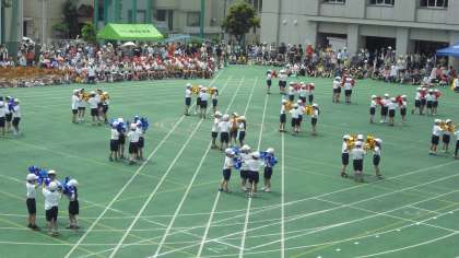 1年生は「ジャンプ1」赤、青、金のポンポンを持ってかわいく飛び跳ねながらダンスしました。