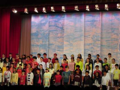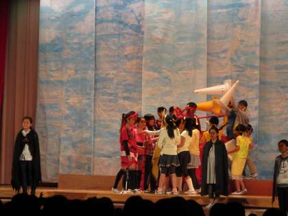 駒沢小学校の子どもたちが、天使のいたずらに惑わされながらも、協力・友情・勇気のよさに気づく物語を演じました。体育館全体を使う演出に、会場全体が沸き、観客全員の心をわしずかみにする発表でした。