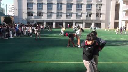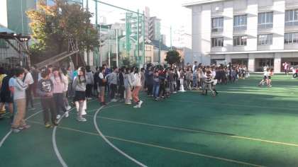 今日の集会は、クラス対抗ボール運びゲームでした。2人で協力して楽しくゲームを行いました。1位は1年3組、2年1組でした。次回の集会も楽しみですね。