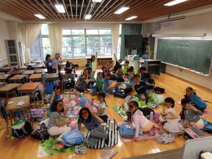お昼は、お家の方が作ってくださったおいしいお弁当を、クラスのみんなで食べました。次は、いいお天気になるといいです。