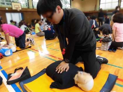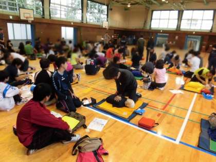 本日、弦巻小学校で先生たちが救命救急法の研修を行いました。