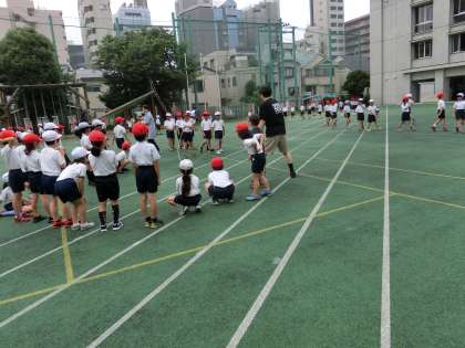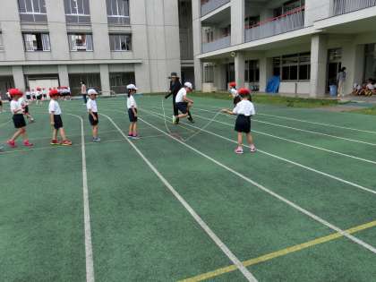 今日は体育朝会で、長縄をしました。1年生は大波小波、2年生は大縄跳びとしました。縄に入るタイミングを合わせて、上手に跳んでいました。